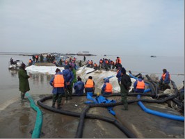 在风浪大、潮流急、寒潮频繁的恶劣自然条件工况下,要在一个多月的时间内完成龙口合拢任务谈何容易。但节点就是红线,在集团公司领导的支持下,金山保滩项目部团队“战天斗地博金山浪涛、齐心协力筑圈围大堤”,适时加大施工强度,增派土石方施工作业船舶及设备人员,日均供砂产量达到8000方,日均抛石量达5000方,为春节前合拢的目标奠定了良好的基础。同时,项目部积极做好与海塘所、石化、边防、金山海事等各方的协调工作,对施工队伍采取“动态控制,实时调整计划”的进程控制策略,与施工队伍签订安全生产协议,进度生产协议,编制项目整体进度计划,以确保工程施工安全、顺利如期进行。最终金山保滩项目部经过30个没日没夜的有效工作日,累计完成土方量16万方、抛石4万方,于2014年1月25日完成了龙口合拢,圆满实现了春节前龙口合拢的既定目标。
