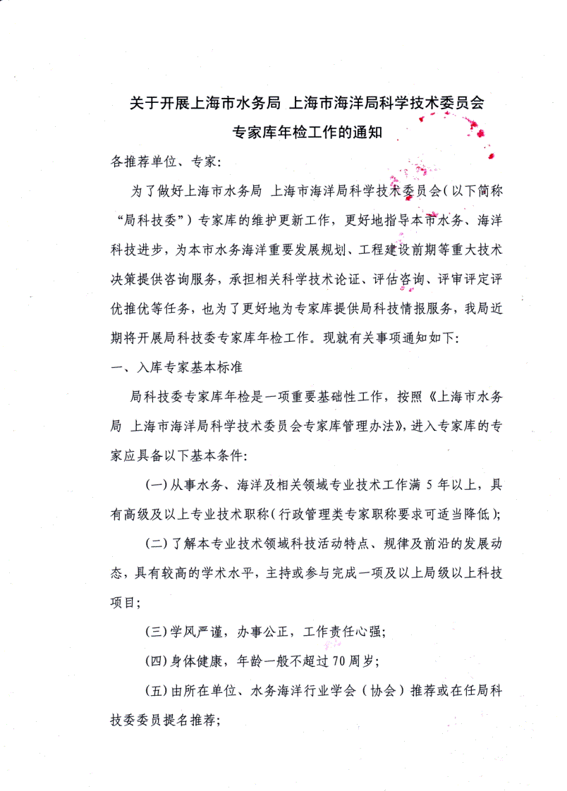 转发《关于开展上海市水务局 上海市海洋局科学技术委员会专家库年检工作的通知》