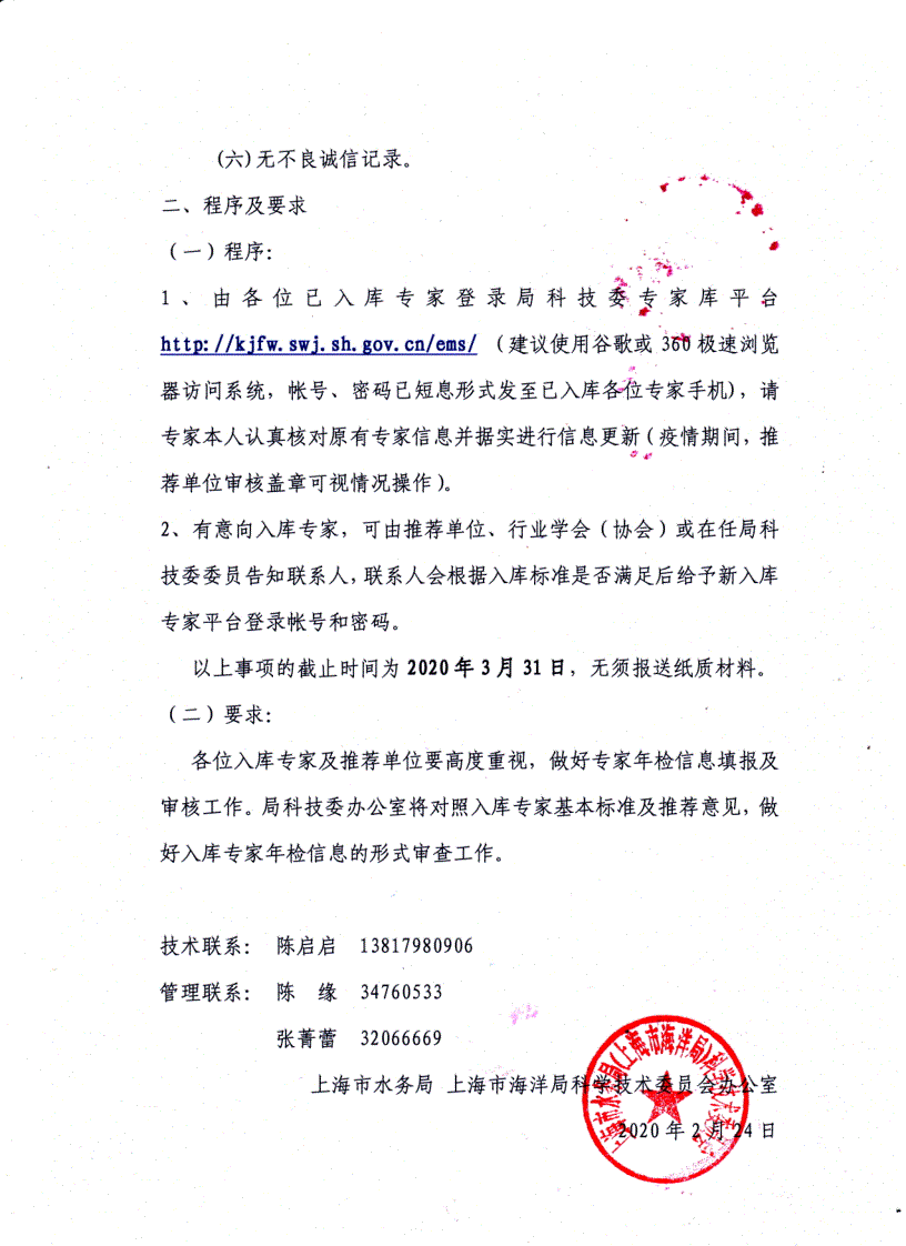 为配合服务和支持上海市水务局 上海市海洋局科学技术委员会(以下简称“局科技委”)专家库的维护更新工作,更好地指导本市水务、海洋科技进步,为本市水务海洋重要发展规划、工程建设前期等重大技术决策提供咨询服务、承担相关科学技术论证、评估咨询、评审评定评优推先等任务,也为了更好地为专家库提供局科技情报服务,现将局科技委《关于开展上海市水务局 上海市海洋局科学技术委员会专家库年检工作的通知》(以下简称“通知”)转发给你们,请各会员单位于2020年3月31日前按通知要求进行入库专家年检信息填报及审核工作。