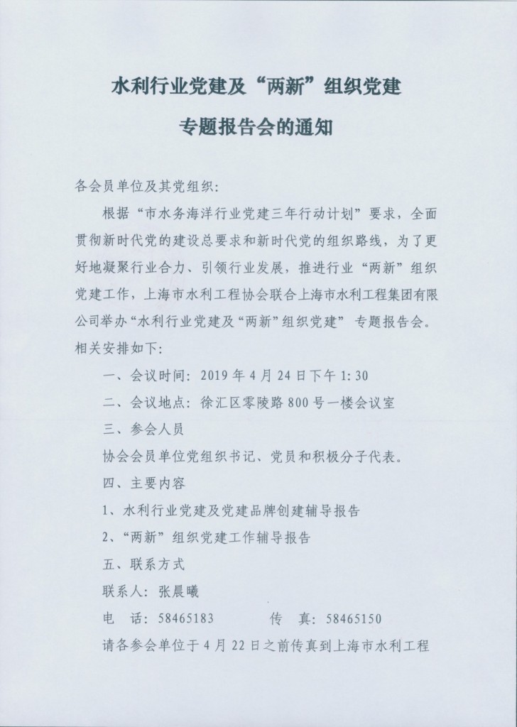 水利行业党建及“两新”组织党建专题报告会的预通知
