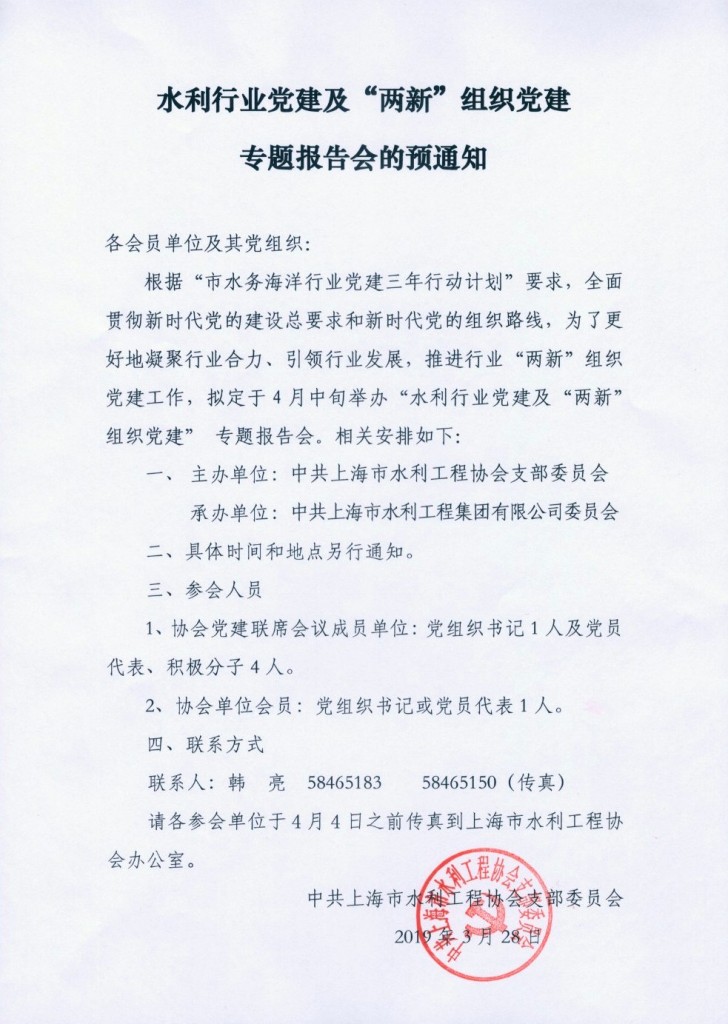 水利行业党建及“两新”组织党建专题报告会的预通知