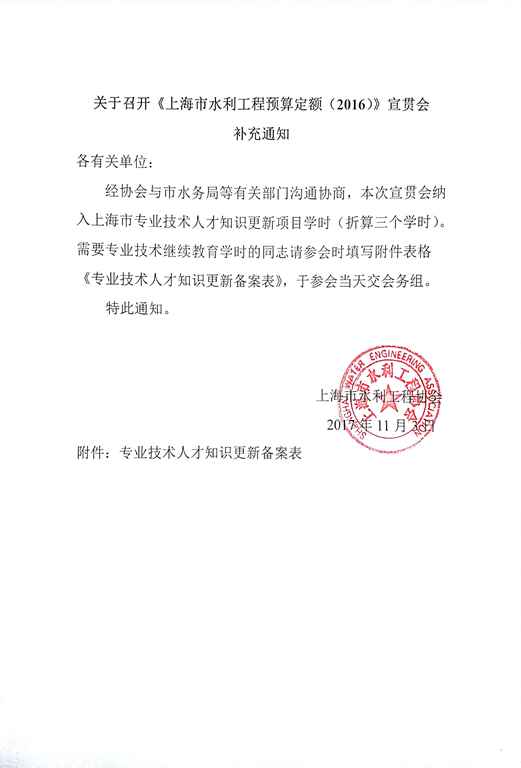 关于召开《上海市水利工程预算定额(2016)》宣贯会补充通知