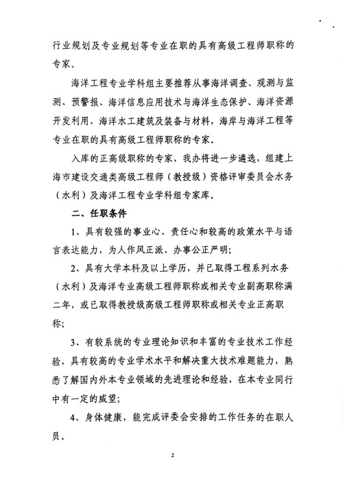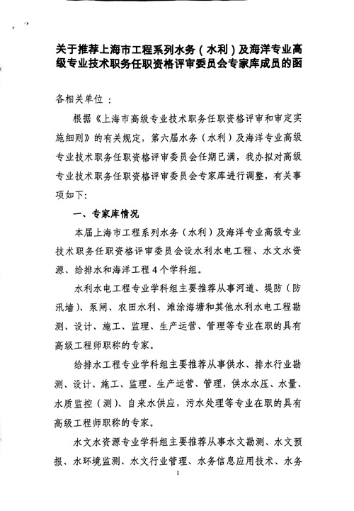 关于推荐上海市工程系列水务(水利)及海洋专业高级专业技术职务任职资格评审委员会专家库成员的函