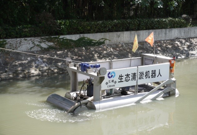 上海汇胜水利工程有限公司分享了《泵站排口积泥生态疏浚装备和应用案例》,该技术通过前期积泥粗垃圾清理,再运用生态清淤机器人底泥收集装置泵吸泵站口积泥,将泥水混合物输送至短驳船进行初步沉淀,再将其运输至干化船进行絮凝脱水干化处理。全套处理设备皆集中于船上,可解决中心城区泵站口积泥吸除场地缺乏问题,同时大幅减少市政泵站雨天排水对河道水质的影响。