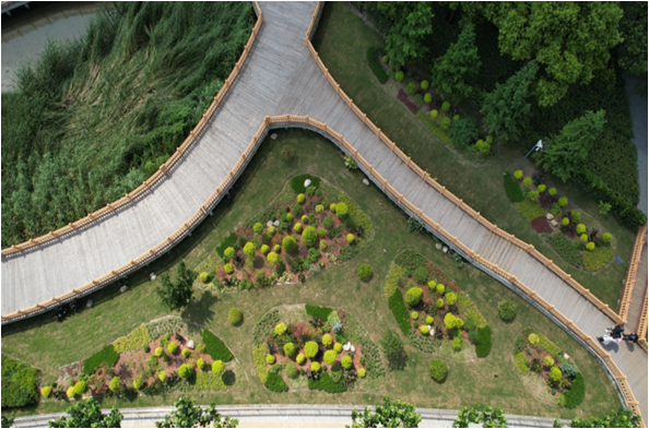 西华漕达绿化景观以美人蕉为核心,巧妙布局于四个小岛之上,每个岛屿分别配以金边麦冬、金叶石菖蒲、吉祥草、兰花和三七作为地被植物,外围则满铺果岭草,营造出丰富的层次感,达到视觉上的美感和生态环境的平衡。