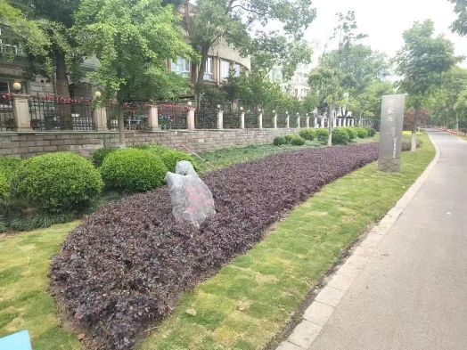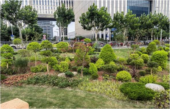 竹林路口绿地选用黄金柳、红枫、棒棒糖、蓝冰柏等独具特色的灌木,并结合八仙花、月季、肾蕨、狼尾草、南天竹等多种地被植物,辅以景石点缀,形成了层次分明、色彩斑斓的绿化效果。