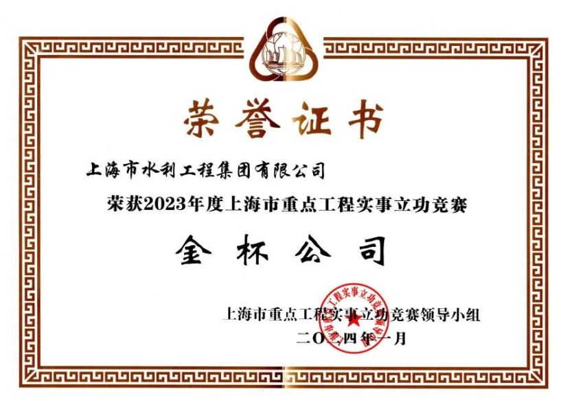 在2023年度上海市重点工程实事立功竞赛中,上海市水利工程集团有限公司从全市承担市重大工程建设任务的上万家参赛企业中脱颖而出,获评立功竞赛最高荣誉---“金杯公司”称号,这也是上水集团连续第七次获此殊荣。