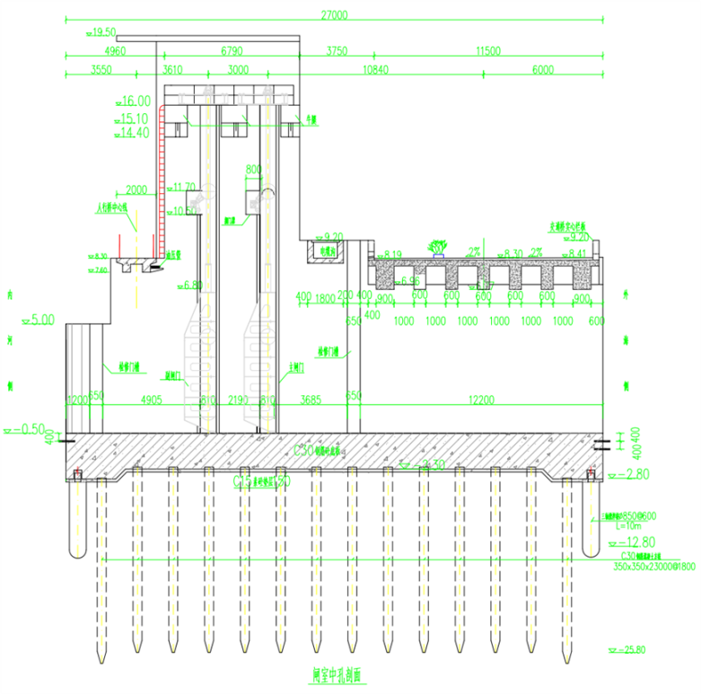 南门港水闸项目此次浇筑的闸室边墩高度11.5m,中墩高度16.5m,胸墙、检修平台、人行桥、电缆沟、牛腿等结构均随墩墙同步一次性浇筑到顶,无水平施工缝。不足2米宽的模板空间内螺杆、钢筋纵横交错,作业面狭小,加上多达30余处的吊模,30多度的高温,给本次浇筑带来了极大的难度。