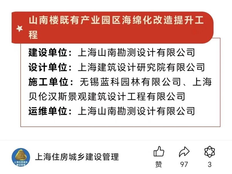 为深入贯彻市委、市政府关于推进海绵城市建设的决策部署,高质量推进本市海绵城市建设,充分发挥海绵城市精品工程示范引领作用,市住建委在全市范围内开展了2024年度全市海绵城市精品工程评定工作。全市共申报60个海绵城市示范项目,涵盖了建筑小区、公园绿地、道路广场及河道水务等类型,经过合规性审查、公众投票、专家审查、综合评定等工作,最终评定10个海绵城市精品工程。公司山南楼既有产业园区海绵化改造提升工程荣获10个海绵城市精品工程之一。