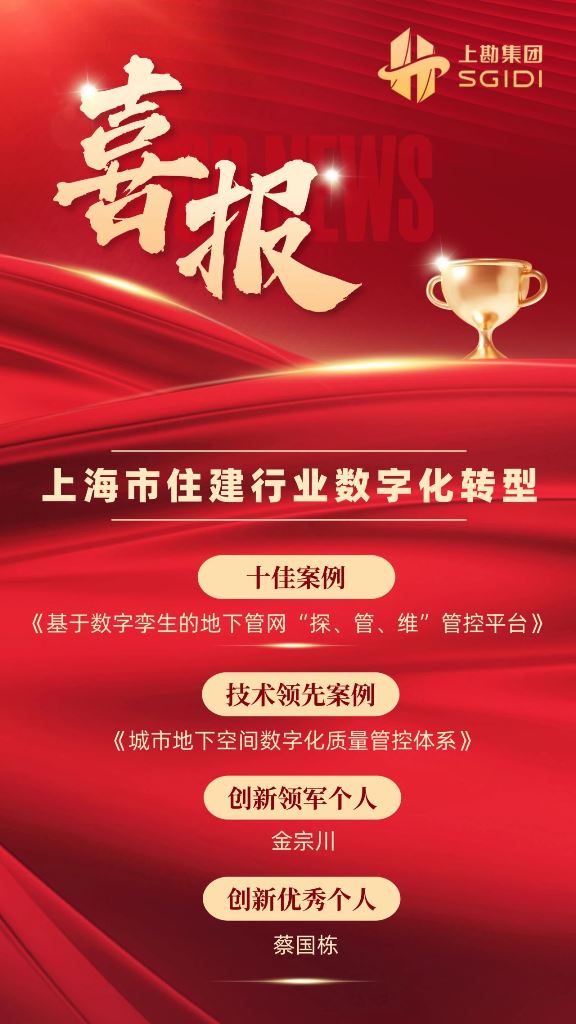大会公布了市住建行业数字化转型优秀案例及创新人才选育入选名单,上勘集团《基于数字孪生的地下管网“探、管、维”管控平台》获“十佳案例”,《城市地下空间数字化质量管控体系》获“技术领先案例”,上勘集团副总裁、信息院院长金宗川荣获“创新领军个人”称号,上勘集团蔡国栋获“创新优秀个人”表彰。热烈祝贺!