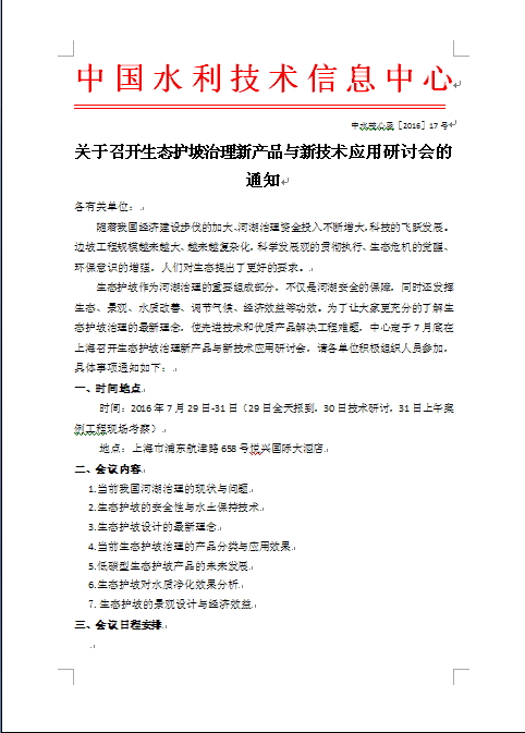 中国水利技术信息中心定于7月30日(六)上午9:00,在浦东航津路658号悦兴国际大酒店,举办“生态护坡治理新产品与新技术应用研讨会”。