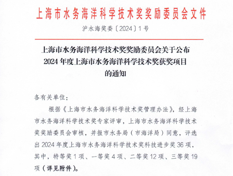 经上海市水务海洋科学技术奖专家评审,上海市水务海洋科学技术奖奖励委员会审核,报市水务局(市海洋局)同意,并向社会公示无异议后,评选出 2024年度上海市水务海洋科学技术奖科技进步奖36项,其中,特等奖1项、一等奖4项、二等奖12项、三等奖19项。由市水利工程协会推荐的三个研究项目在激烈角逐中脱颖而出,并分获2个二等奖和1个三等奖。对进一步调动广大水务海洋科技工作者的积极性和创造性,激励本市水务海洋人才创新和技术进步,培育和促进水利新质生产力,推动水务海洋事业高质量发展,有着积极的意义和较深的影响。
