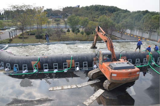 2014年11月3日、11日上海市堤防(泵闸)设施管理处:胡欣、周建军、张健明、赵政等领导在元荡节制闸进行“装配式橡胶坝临时防汛堤”二次测试。通过控制内部水压力使冲水后高度为1.5米,用挖机做翻浪,挡水水头为1.2米,通过测试,不断在改进和提高,圆满实现了充水管袋以水挡水的方法;是市堤防处多年来研制的一种防汛抢险新设施。