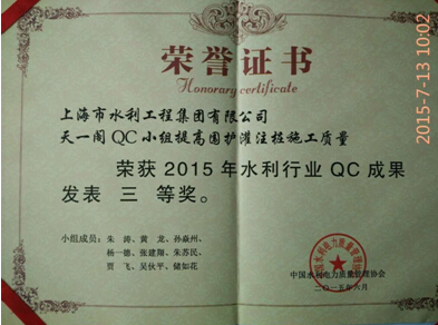 本次发表会共有99项QC成果、11项质量信得过班组进行了现场发表,各小组发表人员从选题、原因分析、对策与实施、效果确认等方面对QC小组成果进行了精彩的演讲,评委和见习评委都认真做了点评。经过激烈角逐,上水集团虹口港泵闸工程“天一阁”QC小组的“提高围护灌注桩施工质量” 荣获2015年水利行业优秀质量管理小组QC成果三等奖。据了解,上水集团是上海市水利建设行业内唯一荣获此项表彰的企业。