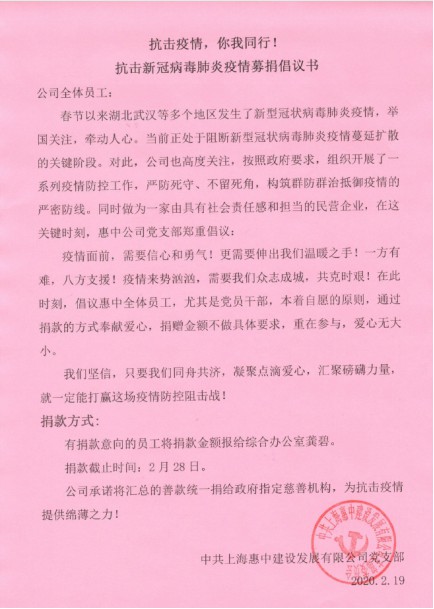 同时作为一个由具有社会责任感和担当的民营企业,该公司第一时间开启募捐通道,公司向长兴商会捐款壹万元支援疫情防控一线;董事长谢思涌、总经理郁彩虹分别通过金山区民建第九支部、长兴镇商会进行了爱心捐款;惠鑫农庄2月10日向金山区吕巷镇防控一线工作人员捐增了160斤新鲜草莓;公司党支部于2月24日向长兴镇疫情防控一线工作人员捐赠一批慰问品。公司党支部同时向全体员工发起募捐倡议书,一方有难,八方支援!