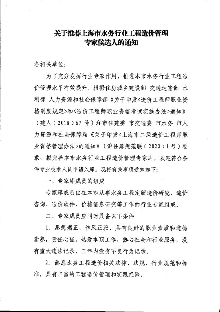 转发市水务局关于推荐上海市水务行业工程造价管理专家候选人的通知