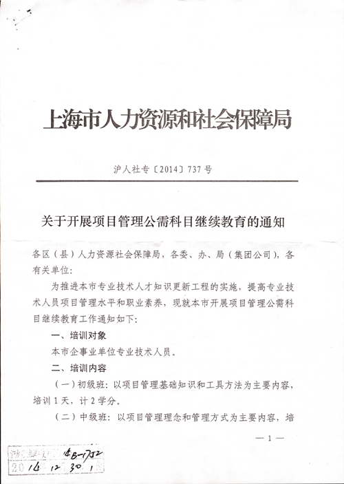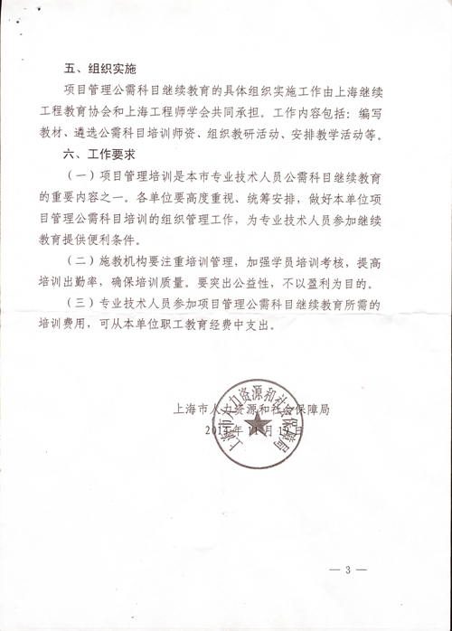 上海市人力资源和社会保障局关于开展项目管理公需科目继续教育的通知