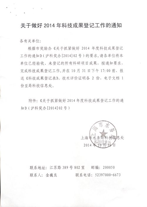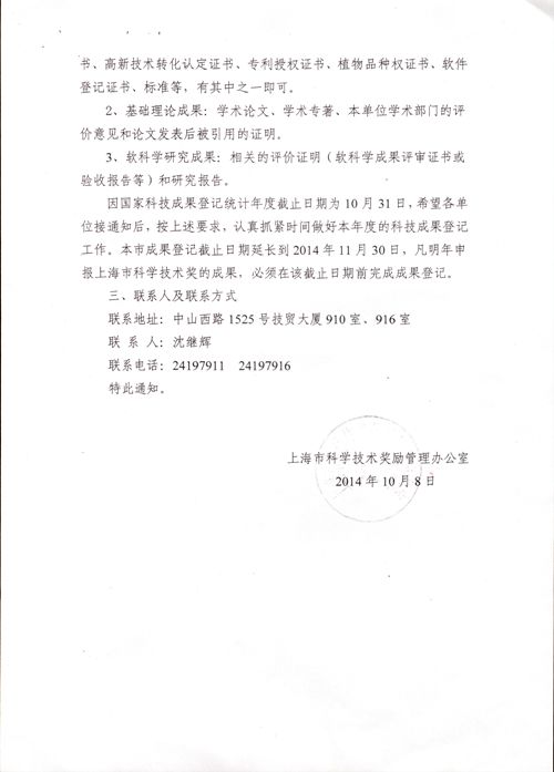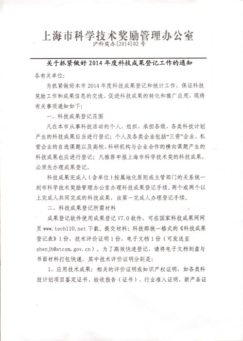 2、《关于抓紧做好2014年度科技成果登记工作的通知》(沪科奖办[2014]02号)